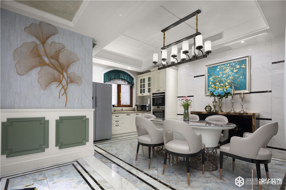靠近餐厅的墙上,采用了别致的银杏叶挂件,既富有文艺气息(符合业主本身的文艺调性),又律动感十足,让人移不开眼。