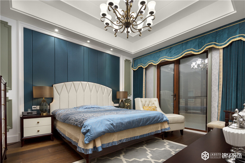 卧室延续蓝色系,既呼应了客餐厅空间的色调,又营造了沉稳静谧的休息氛围。对于被忙碌生活以及工作包围的业主来说,这样的空间可以缓解白日的疲惫,让身心得到有效的放松!